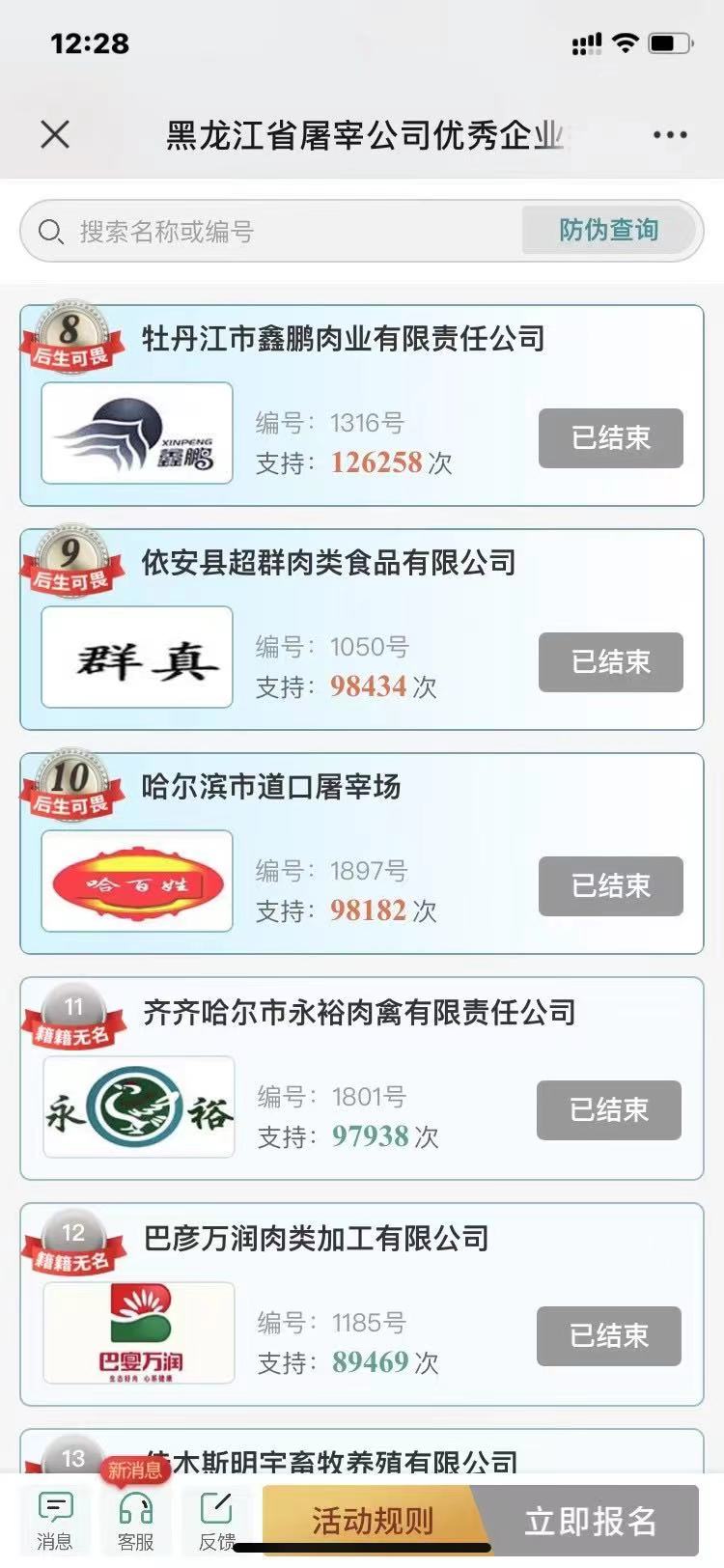 牡丹江市鑫鵬肉業(yè)有限責(zé)任公司參加黑龍江省屠宰行業(yè)誠信企業(yè)評(píng)選名列第八!鑫鵬肉業(yè)從籍籍無名到躍升問鼎,取得這份榮譽(yù),是我們共同堅(jiān)持不懈、同心同德的結(jié)果!感謝全體鑫鵬人的齊心努力!感謝摯愛親朋的鼎力協(xié)助!鑫鵬人一定不負(fù)眾望,以更好更優(yōu)質(zhì)的產(chǎn)品回饋家鄉(xiāng)!回饋社會(huì)!